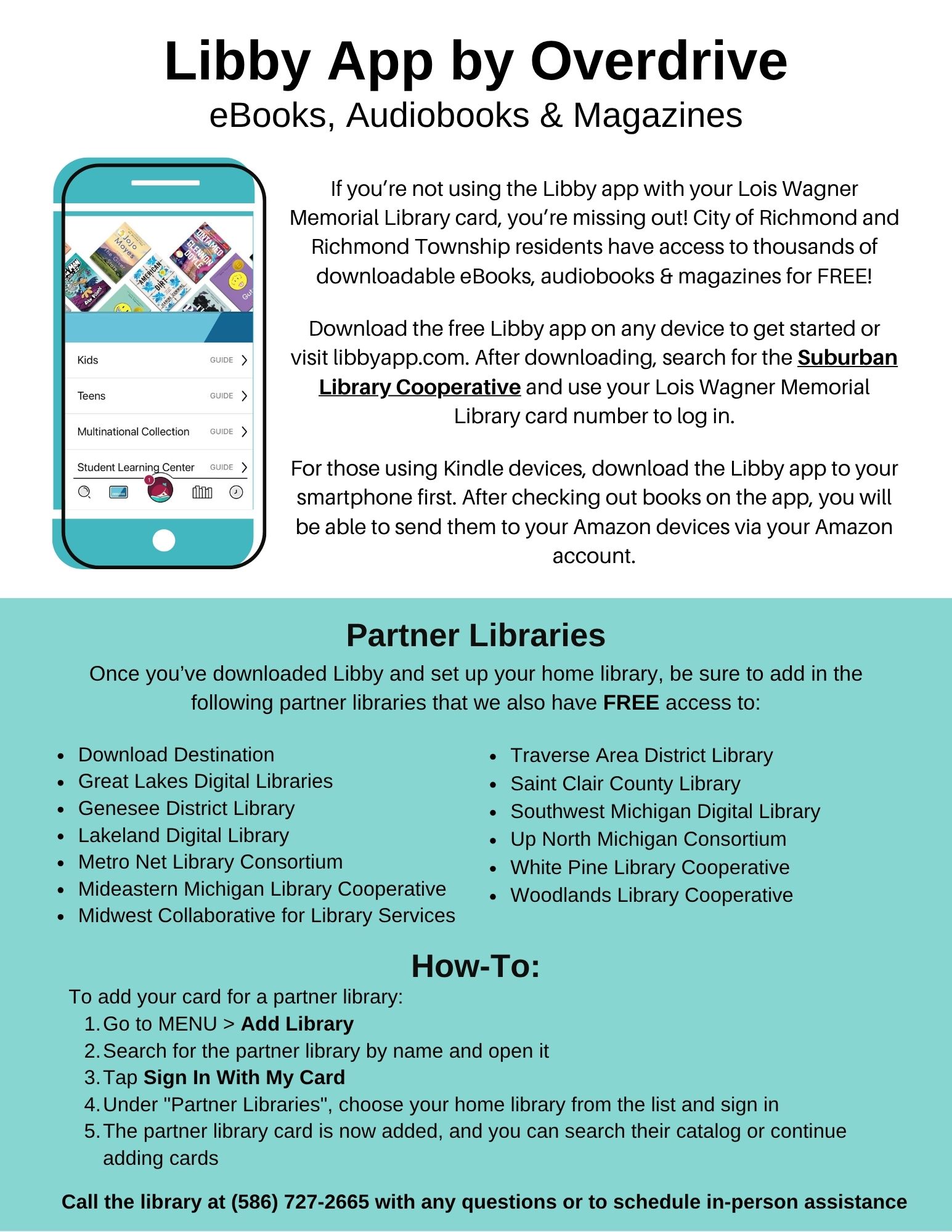 Richmond and Richmond Township residents can borrow ebooks, audiobooks, and magazines to read on their phone or tablet using the Libby app by OverDrive. The app can be downloaded at https://www.overdrive.com/apps/libby/.