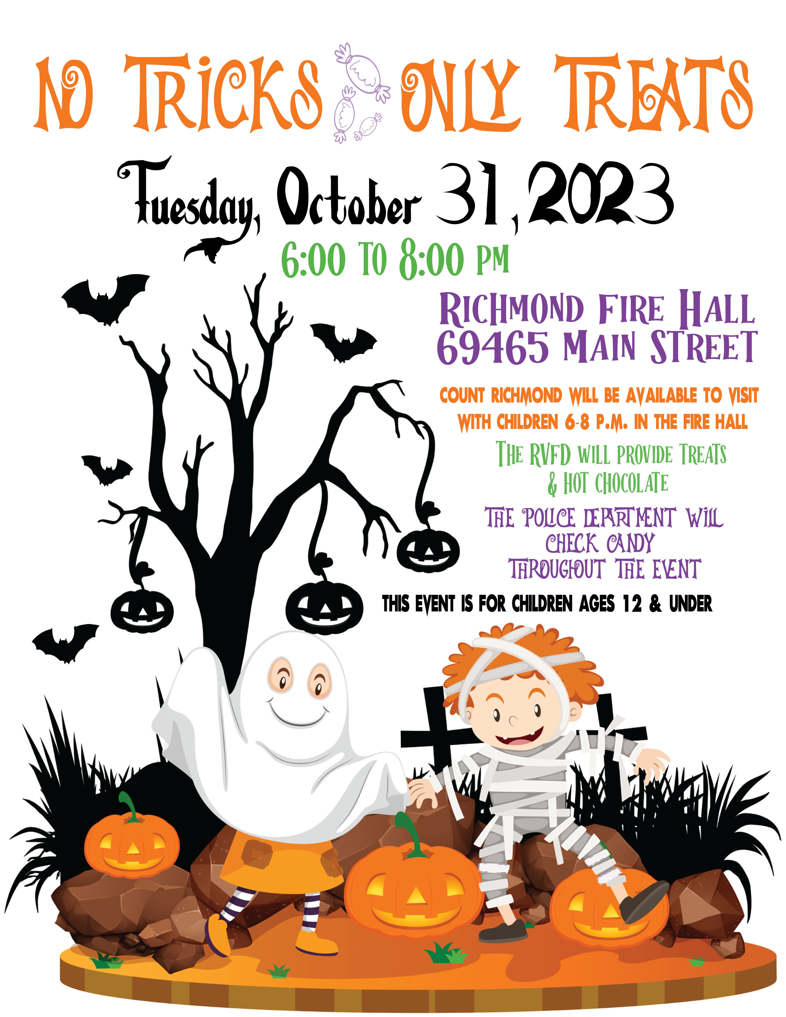 Halloween's No Tricks, Only Treats event will be at the Richmond Fire Hall, 69465 Main Street, 6:00 p.m. - 8:00 p.m. on Halloween.  Stop and visit with Count Richmond and get candy from area businesses, organizations and churches in the parking lot.  The Fire Department will be handing out candy and popcorn and the Police Department will be conducting a candy check.  All events are 6 p.m. to 8 p.m. October 31st. Richmond TV will be taping the children with the Count to air on Channel 6.