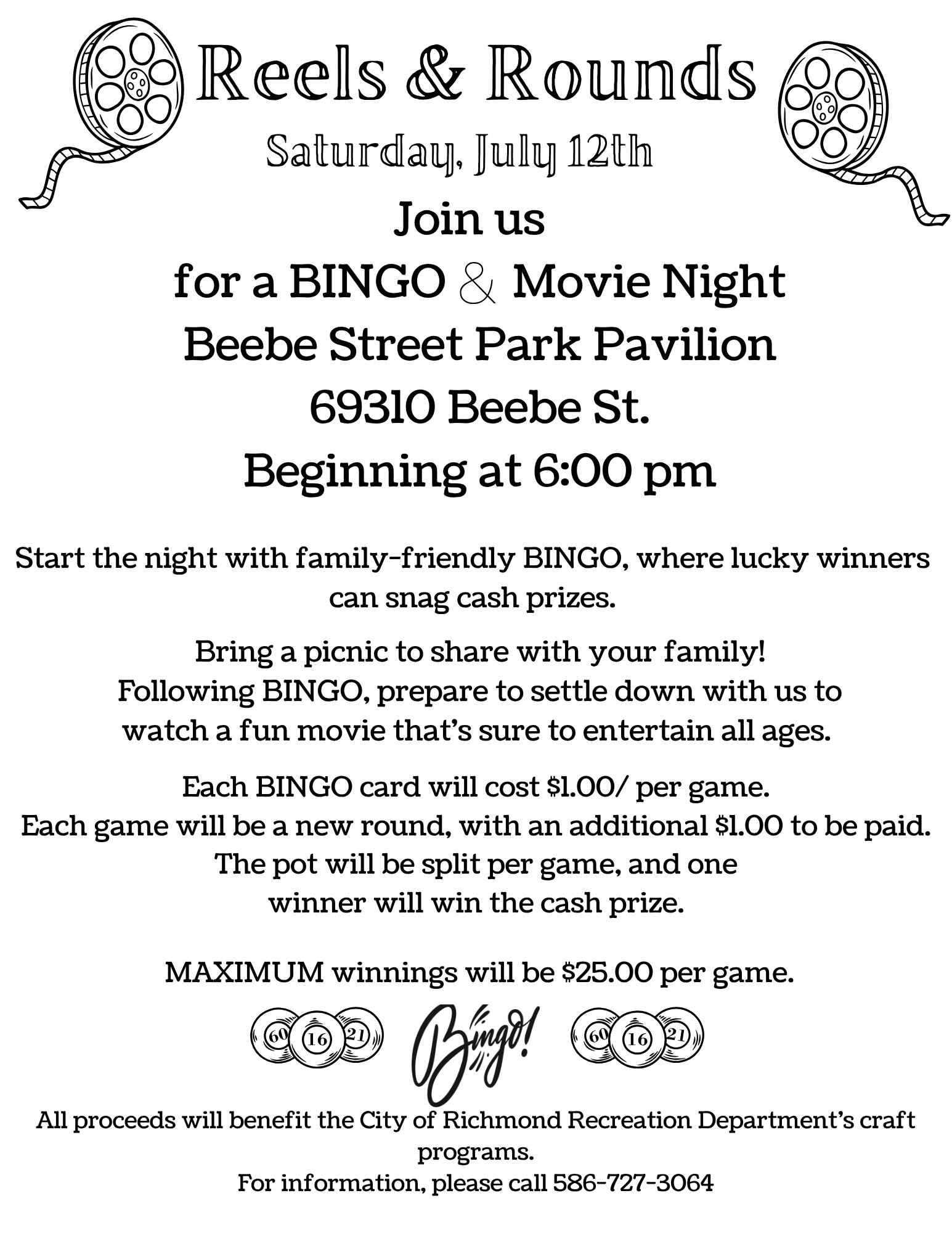 Families will enjoy rounds of Bingo, $1/card per game, with cash prizes being awarded to the winners. After Bingo, attendees will be able to sit back and relax with a family-friendly movie, Minecraft.