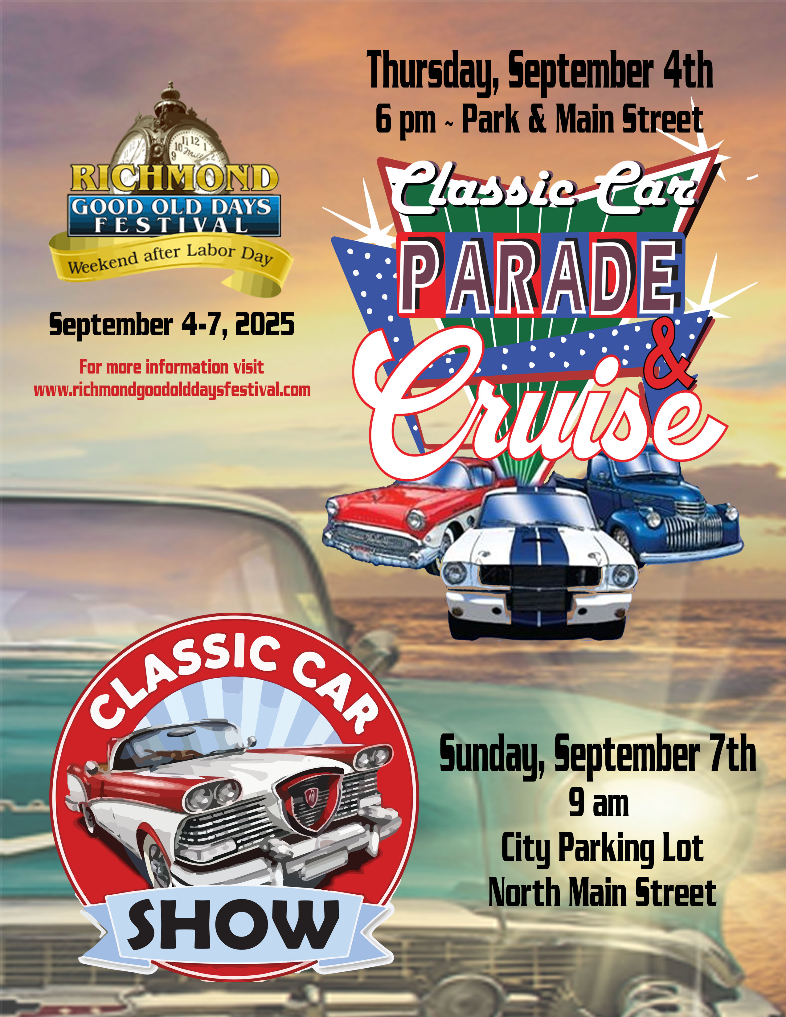 The Classic Car Show will be on Sunday, September 7th at 9am in the City Parking Lot on Main Street near the Veterans Memorial.