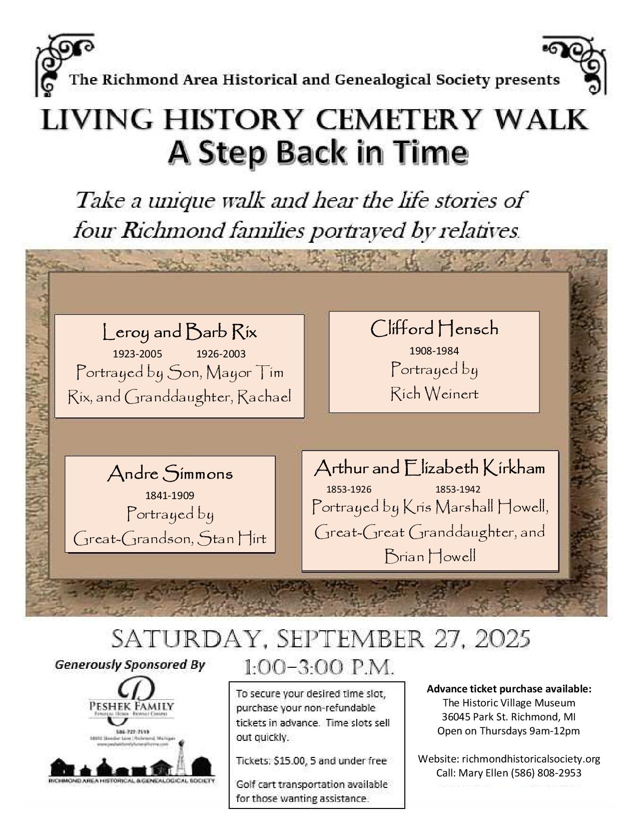 Tickets available at the Historic Village 36045 Park Street Richmond on Thursdays 9:00am-12:00pm. For more information or to purchase your tickets, please contact Mary Ellen at (586) 808-2953.