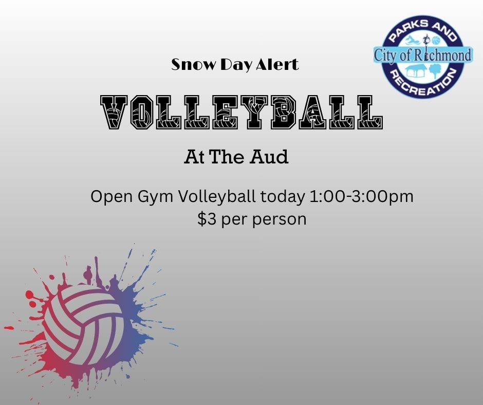Come enjoy the snow day with Volleyball Open Gym at the Aud today, 1pm-3pm, $3/person. Contact the Aud, 68931 Main St, (parking in the back of the building), for more information at (586) 430-4950