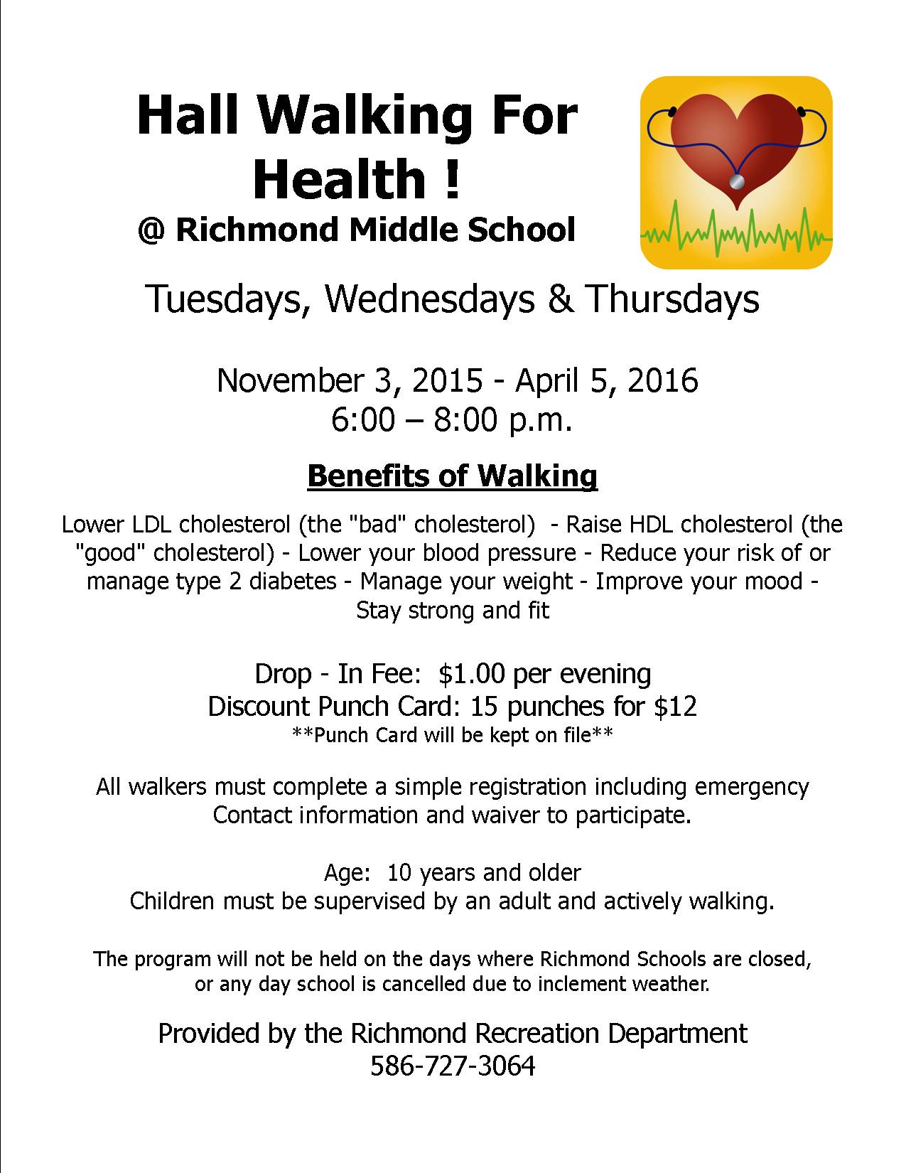 Join the Recreation Department during the cold fall & winter evenings at the Richmond Middle School from 6-8 pm on Tuesdays, Wednesday, &Thursdays, from November through March. Fee is $1 per evening or $12 for a 15 visit punch card. Hall walking will not take place when schools are closed.
