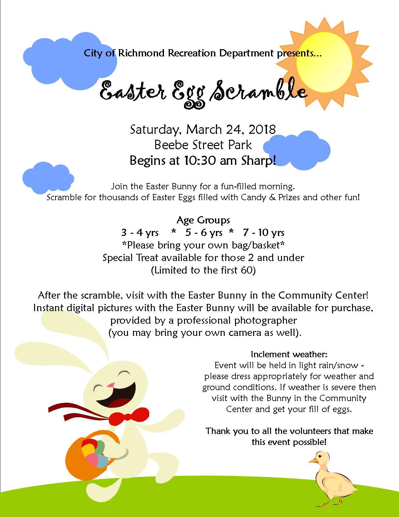 Annual Easter Egg Scramble - The Recreation Department's Easter Egg Scramble is Saturday, March 24, 2018, 10:30 am, at Beebe Park.  Join the Easter Bunny for a fun filled morning.  Scramble for thousands of Easter Eggs filled with Candy and Prizes.  Age Groups 3-4 Years, 5-6 years and 7-10 years.  After the scramble, visit with the Easter Bunny in the Community Center.  Instant Digital pictures with the Easter Bunny will be available for purchase  (you may bring your own camera as well).