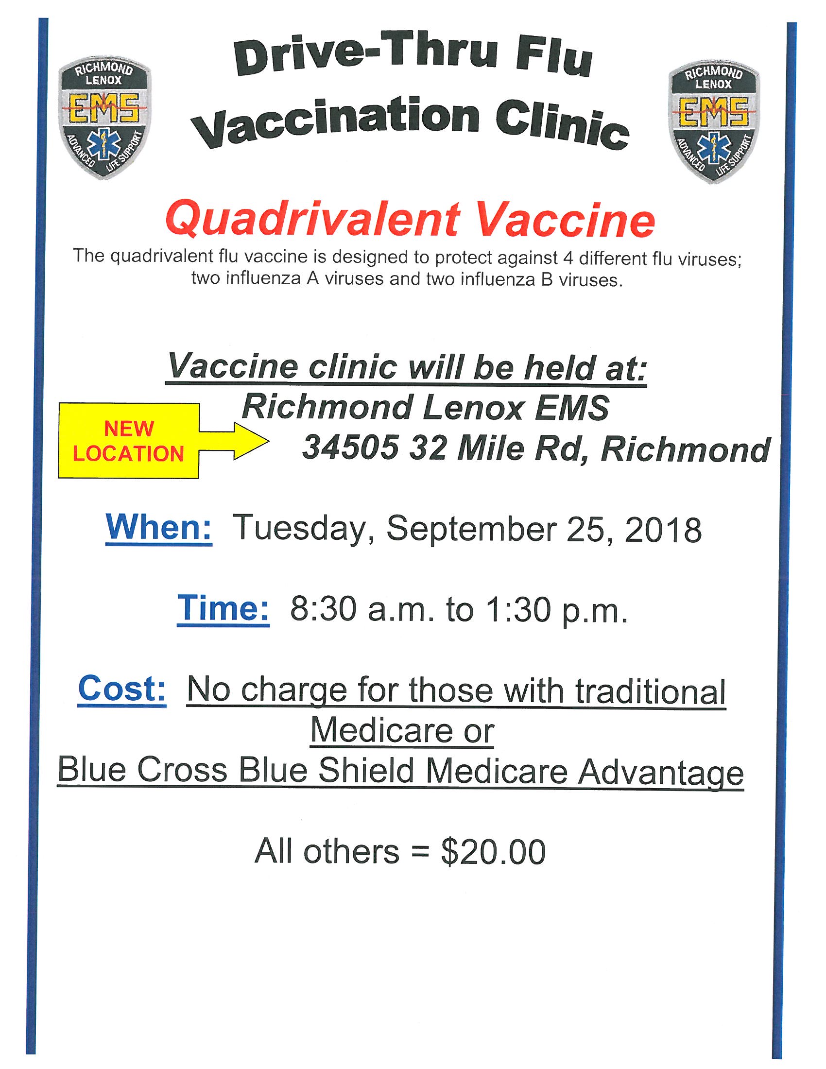 Richmond Lenox EMS is hosting a Quadrivalent Vaccine (flu shot) clinic on Tuesday, September 25th from 8:30 am to 1:30 pm at Richmond Lenox EMS 34505 32 Mile Road.  No charge for those with traditional Medicare or BCBS Medicare Advantage. All others $20
