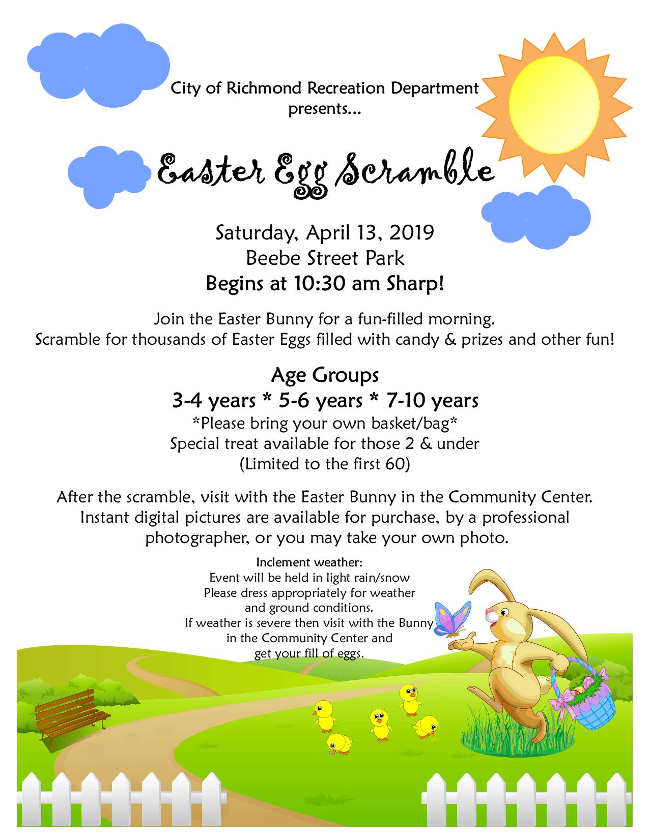Annual Easter Egg Scramble - The Recreation Department's Easter Egg Scramble is Saturday, April 13, 2019, 10:30 am, at Beebe Park. Join the Easter Bunny for a fun filled morning. Scramble for thousands of Easter Eggs filled with Candy and Prizes. Age Groups 3-4 Years, 5-6 years and 7-10 years. After the scramble, visit with the Easter Bunny in the Community Center. Instant Digital pictures with the Easter Bunny will be available for purchase (you may bring your own camera as well).