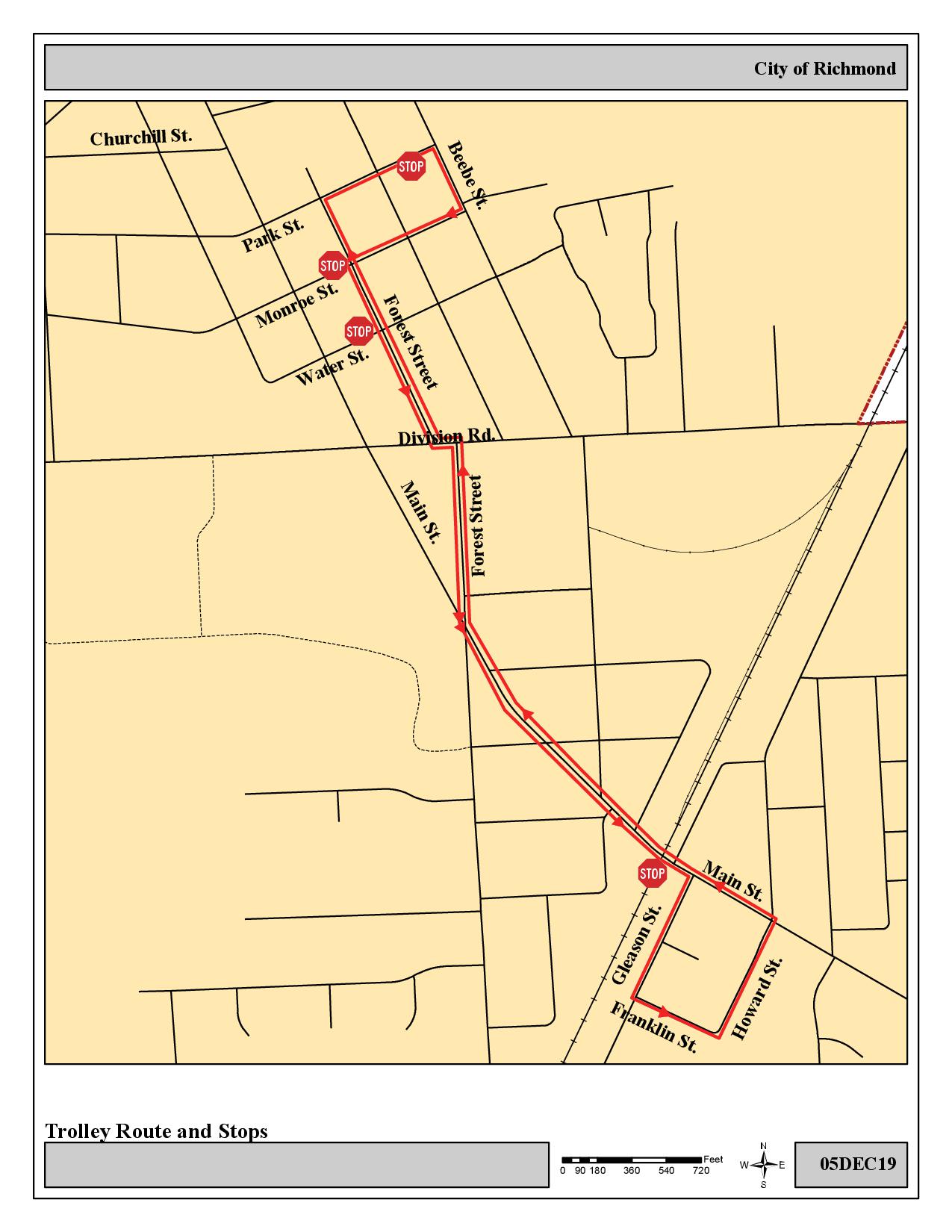 The Richmond Lenox EMS will be offering rides during the Tree Lighting on Saturday, December 7th, from 4 pm to 8 pm from the Gierk Block to the RAHGS Historic Village. They will also have two stops on Forest Street one block from the Community Tree Lighting. Below is a map for the Trolley Stops.