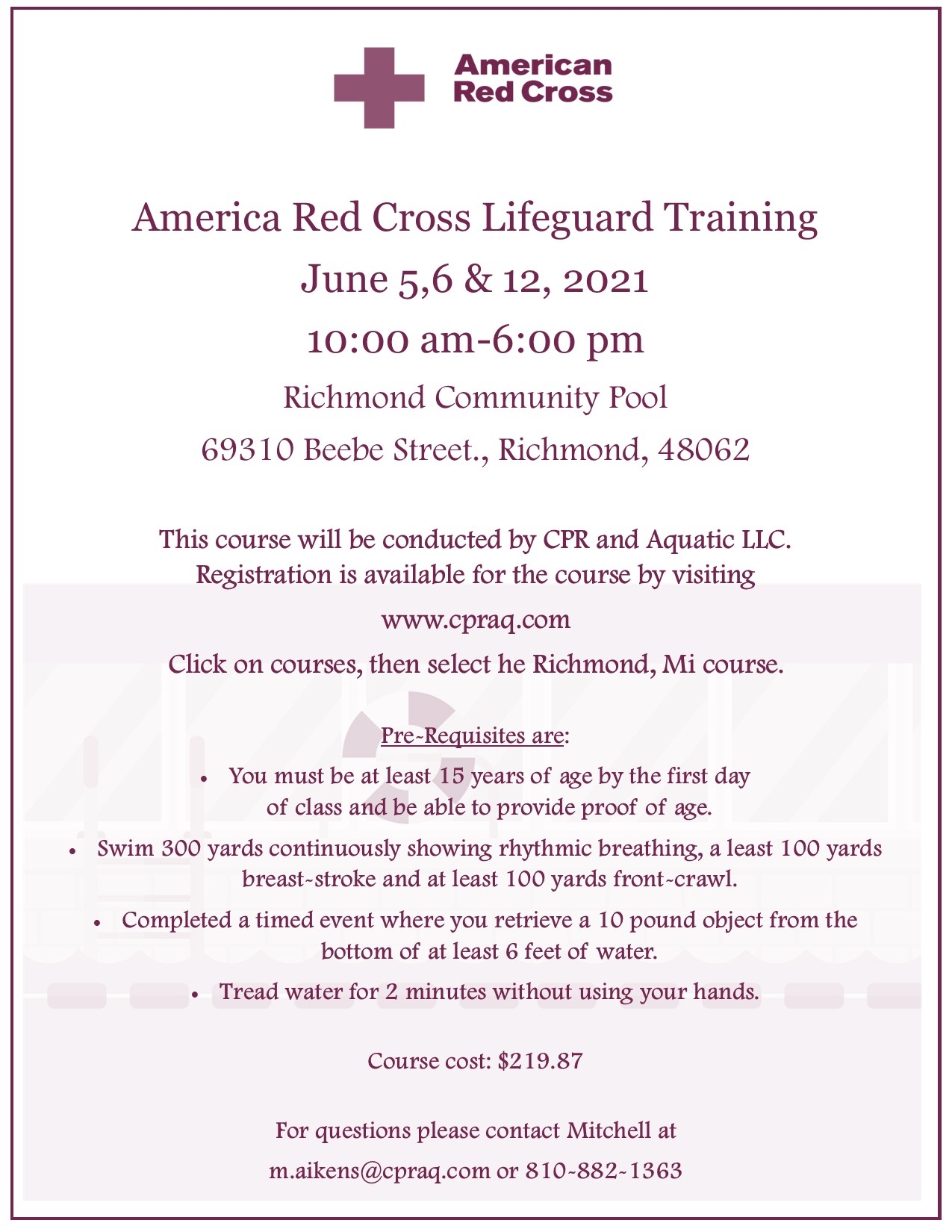 To register, visit www.cpraq.com click on "courses", then select the Richmond MI course OR use this direct link https://cpraq.com/courses/ola/services/richmond-mi-june-5-6-12-lifeguarding-in-person-online?olaT=2021-06-05T14%3A00%3A00.000Z&olaR=1802507