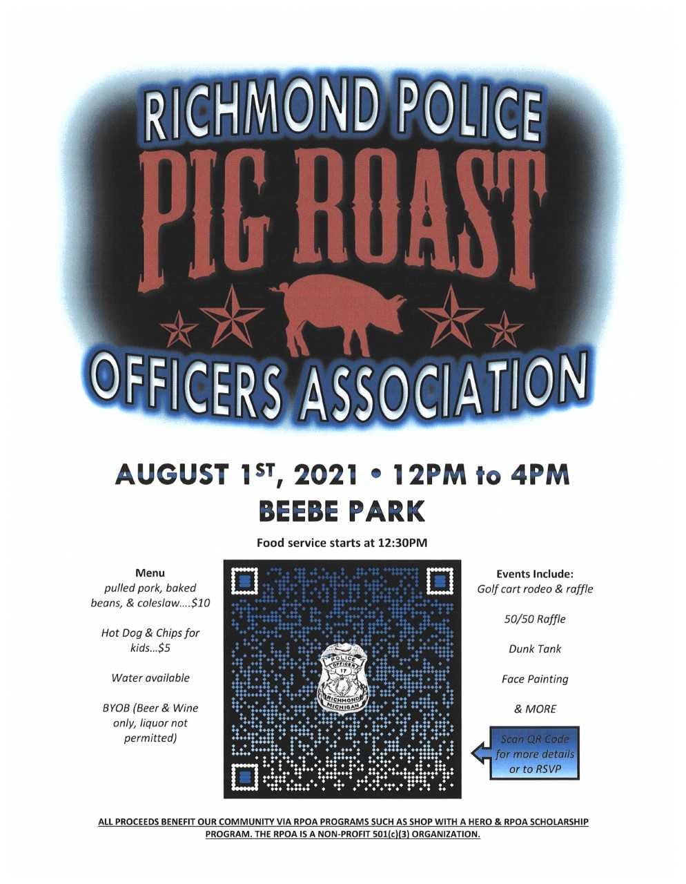 The Richmond Police Officers Association (RPOA) is hosting a Pig Roast on Sunday, August 1, 2021 at Beebe Street Park, 12pm - 4pm. Richmond Police Officers will be working the event, including serving food to all attendees. The planned menu will be pulled pork, baked beans, coleslaw, hot dogs and chips. This event is a community outreach event and is open to the public. Great way to get to know our officers and the newer hires. Tickets for the pig roast will be sold at the door. To let the RPOA know that you plan to attend, you can visit their Facebook page by searching Richmond Police Officers Association, MI and RSVP to the event.