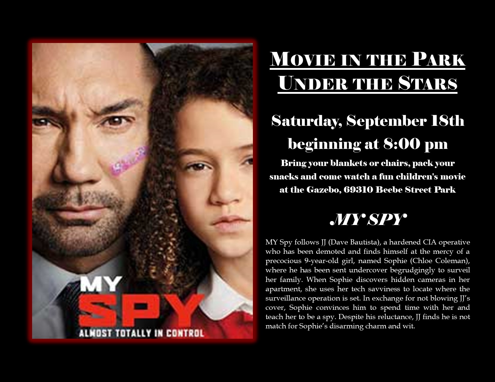 Tonight's movie is My Spy; starring Dave Bautista and Chloe Coleman