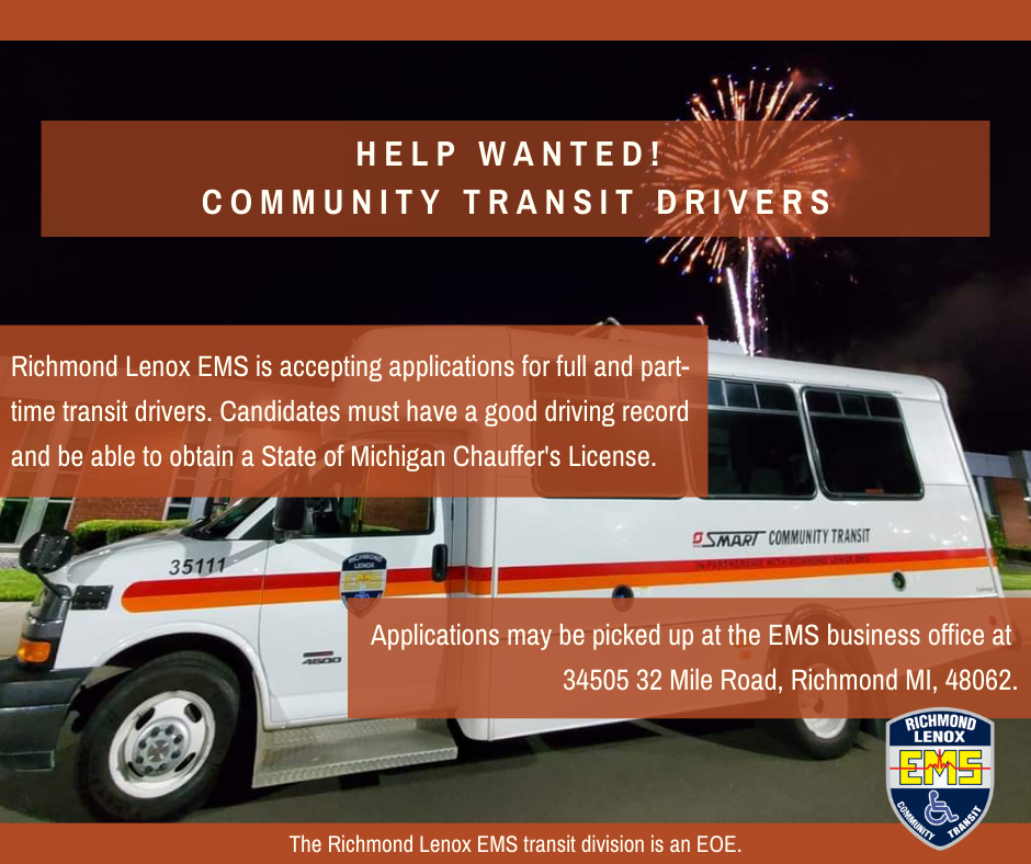 Richmond Lenox EMS is accepting applications for full and part time transit drivers. Candidate must have a good driving record and be able to obtain a State of Michigan Chauffeur's License. Applications can be picked up at the EMS business office located at 34505 32 Mile Road in Richmond.
