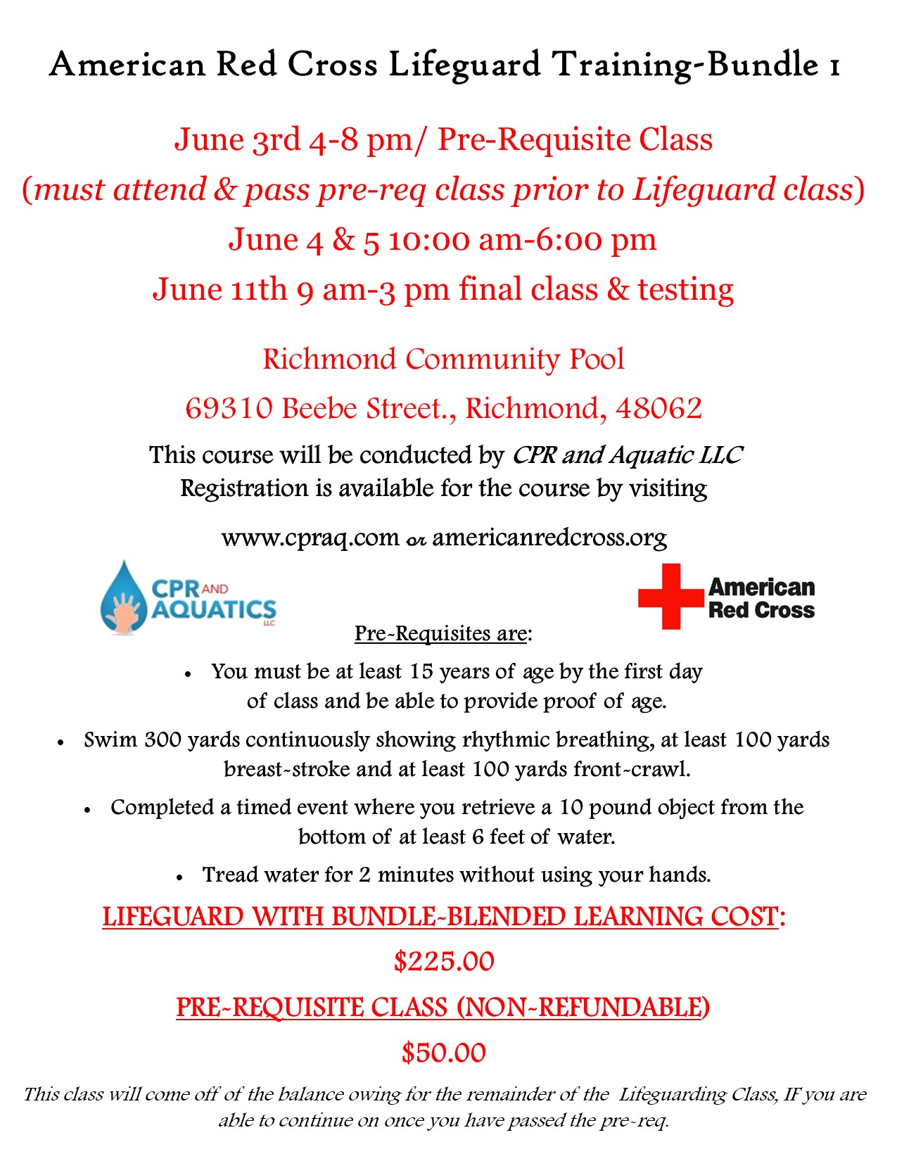 Looking for a fun summer job, where you can work in the sun, and be a part of your community? Then this might be the opportunity for you! The City of Richmond Community Pool will be holding an American Red Cross Lifeguard Training Course, run by CPR & Aquatic LLC, pre-requisite class on June 3rd and classes on June 4 & 5, 2022, 10 am - 6 pm, with the final class being held on June 11, 2022, 9 am - 3 pm at the Community Pool, 69310 Beebe Street. This course will provide the necessary training for any individual interested in working at the Richmond Community Pool as a lifeguard.