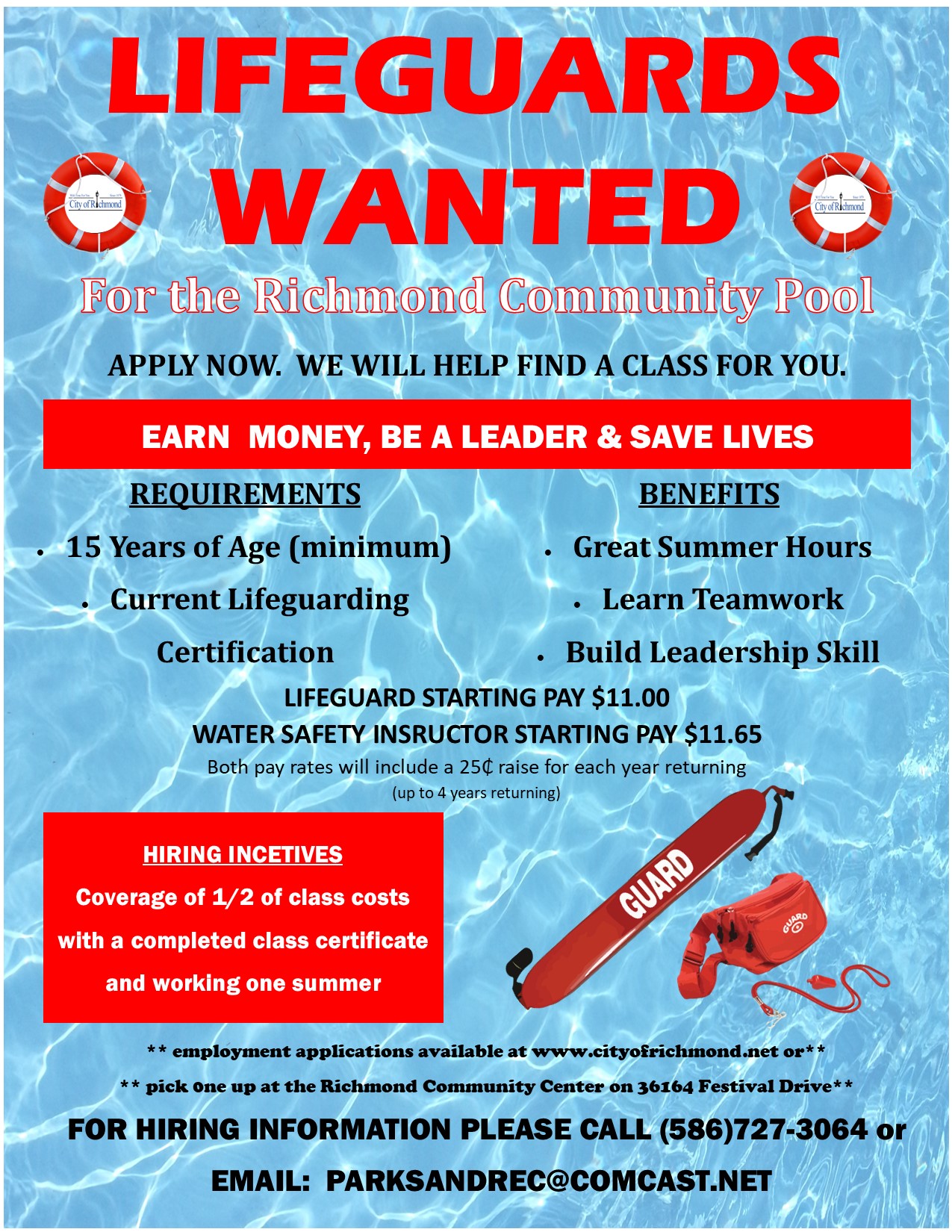 Please click here to view information on the Lifeguard position at the Richmond Community Pool.