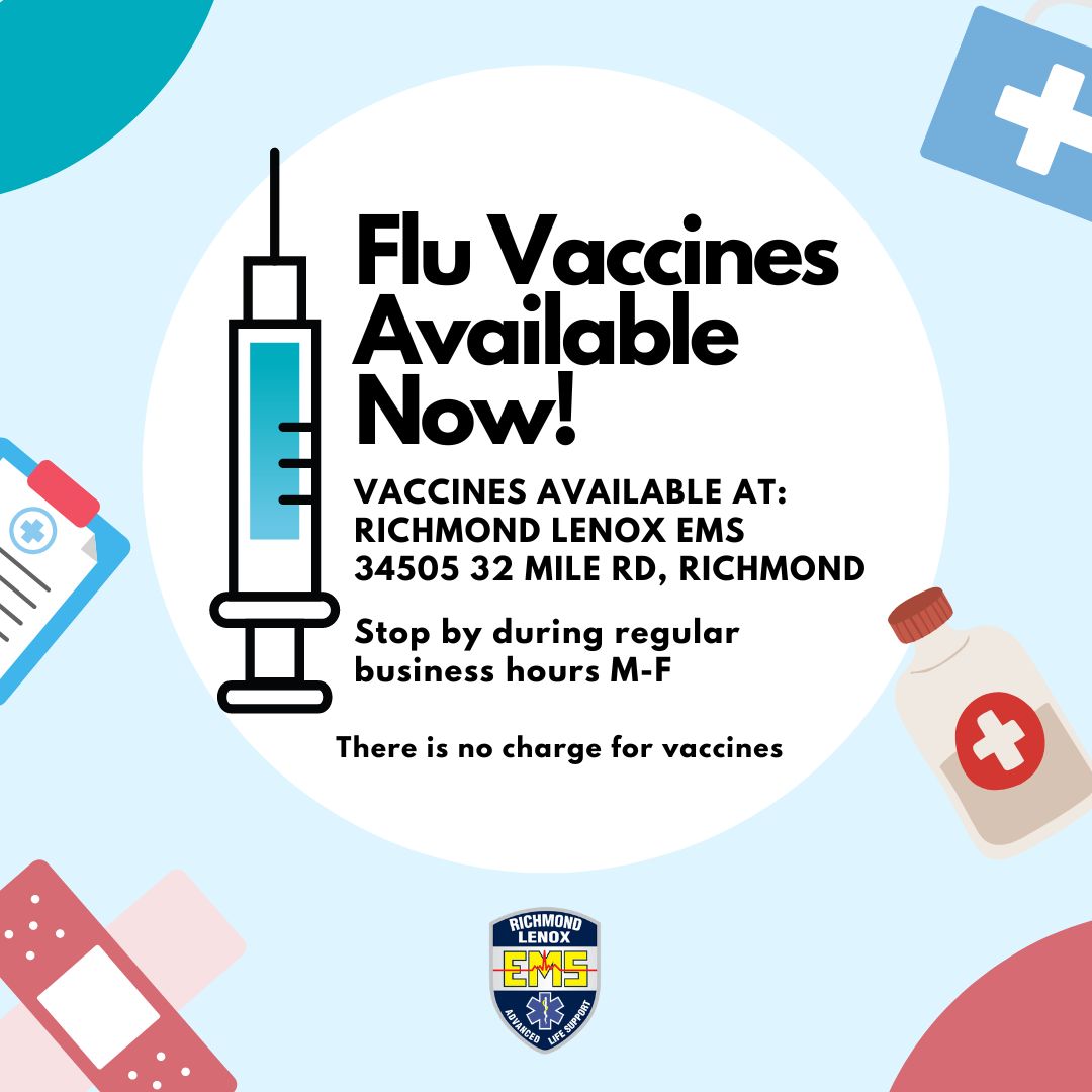 Flu Vaccines are now available at Richmond Lenox EMS, 34505 32 Mile Road. Stop by during regular business hours, Monday through Friday. There is no charge for vaccines.