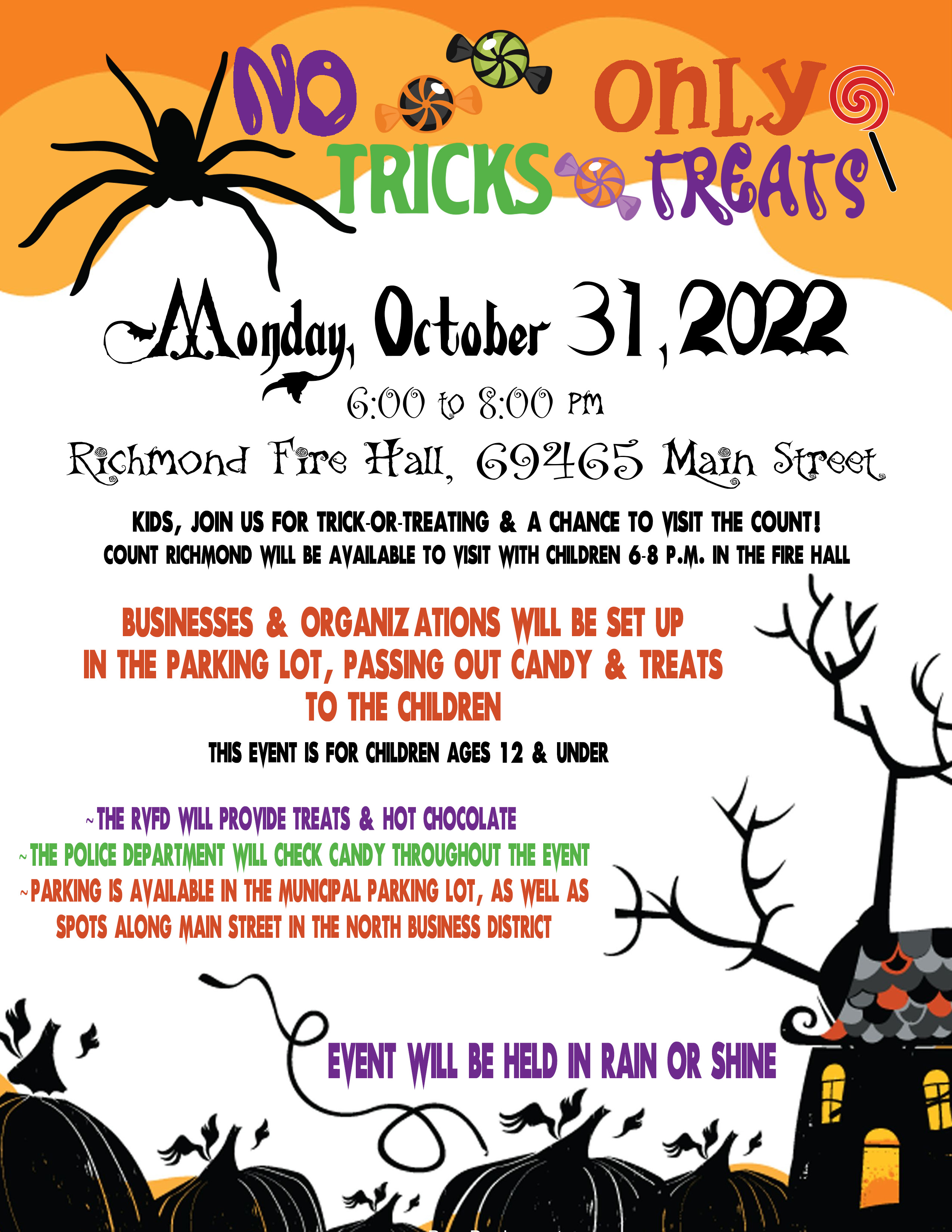 Halloween's No Tricks, Only Treats event will be at the Richmond Fire Hall, 69465 Main Street, 6:00 p.m. - 8:00 p.m. on Halloween.  Stop and visit with Count Richmond and get candy from area businesses, organizations and churches in the parking lot.  The Fire Department will be handing out candy and popcorn and the Police Department will be conducting a candy check.  All events are 6 p.m. to 8 p.m. October 31st. Richmond TV will be taping the children with the Count to air on Channel 6.
